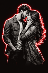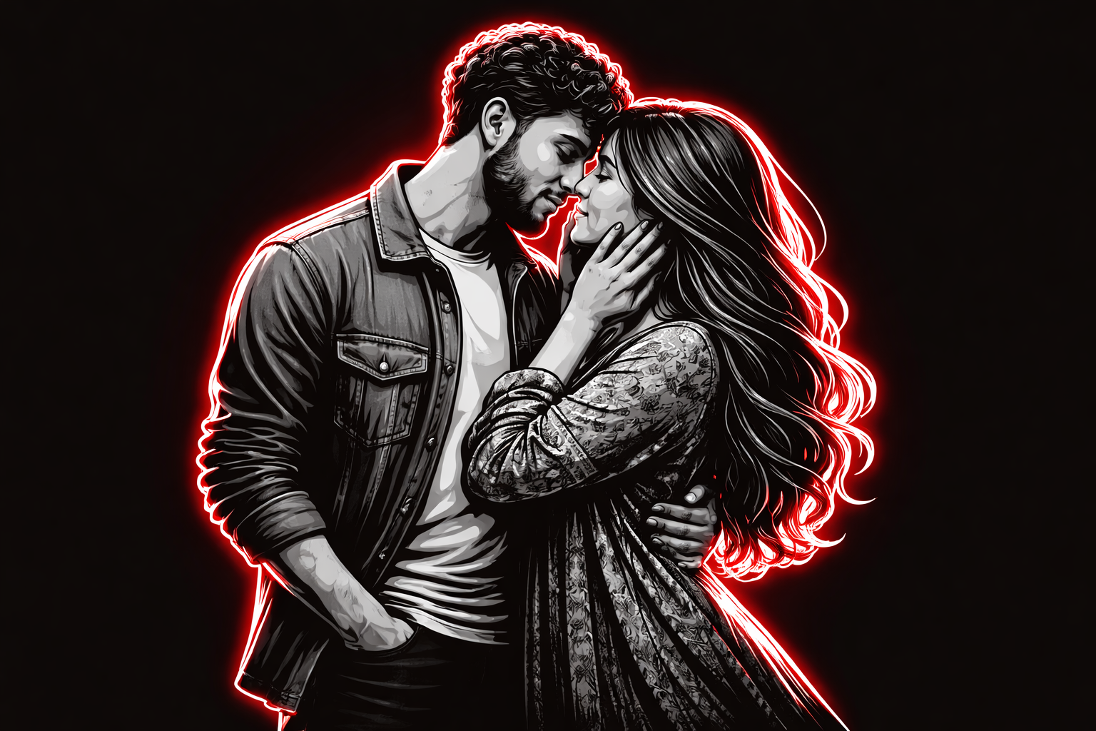 A high-quality digital vector illustration of a young couple in a romantic pose. The man has curly hair, same beard. the woman has very long, wavy hair and a patterned tunic. The entire characters are rendered in grayscaie (black and white) with detailed shading. Set against a solid pitch-black background A thick, vibrant neon red glowing outline traces the entire silhouette of the couple.GTA art style, sharp lines, high contrast.”